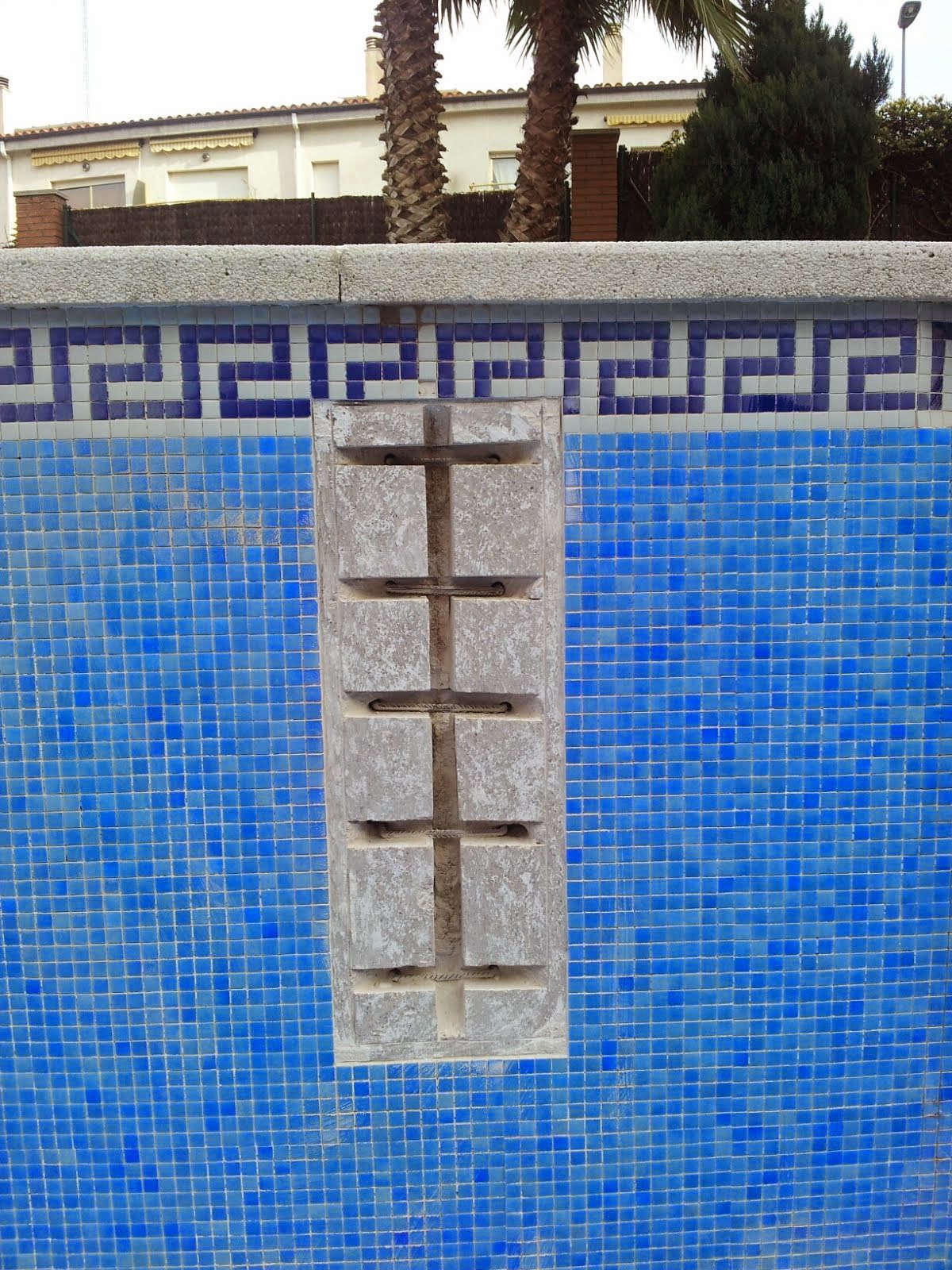 El año pasado al llenar la piscina, no subía de determinado nivel, aparentemente coincide con ese cambio en la disposición de los ladrillos y el agua caía como una cascada en el cuarto de la depuradora que comparte pared con la piscina. A lo largo de toda la piscina, parece que existe una grieta longitudinal (horizontal), aunque hay zonas donde no se aprecia al tener ya muchas capas de pintura. Posiblemente ha estado perdiendo agua a esa altura y el agua ha filtrado en todo el perímetro, ya que la pintura de la pared por debajo de la grieta se desprende fácilmente con una espátula, sin embargo, por encima está bien adherida. Yo no tengo experiencia en estos asuntos y no tengo mucho tiempo, aunque me gusta aprender... por tanto, decidimos consultar en un almacén donde siempre han comprado todo el material, y hacen obras y demás. Lo han valorado y nos han ofrecido dos opciones: